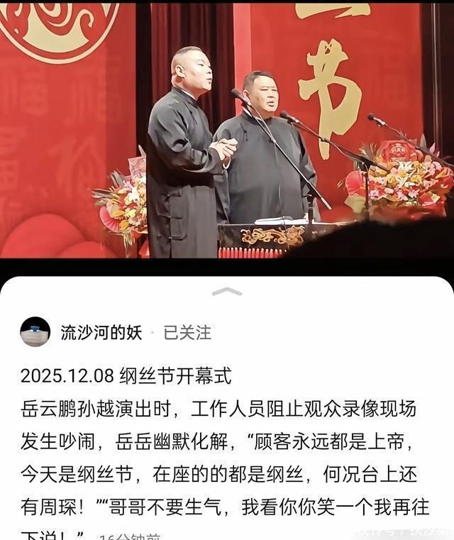 也有人认为,觉得西城文旅做的没错,有一定的约束是对的,也是职责,有人举报不能没有回应。 此外,德云社还发生了一件很特别的事,就是12月8日举行的钢丝节开幕式上,德云社工作人员不让台下观众录像了。 对此,岳云鹏还幽默化解说“顾客永远都是上帝,在坐的都是钢丝”。