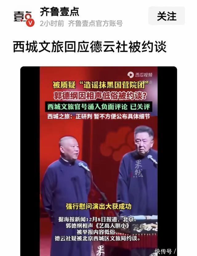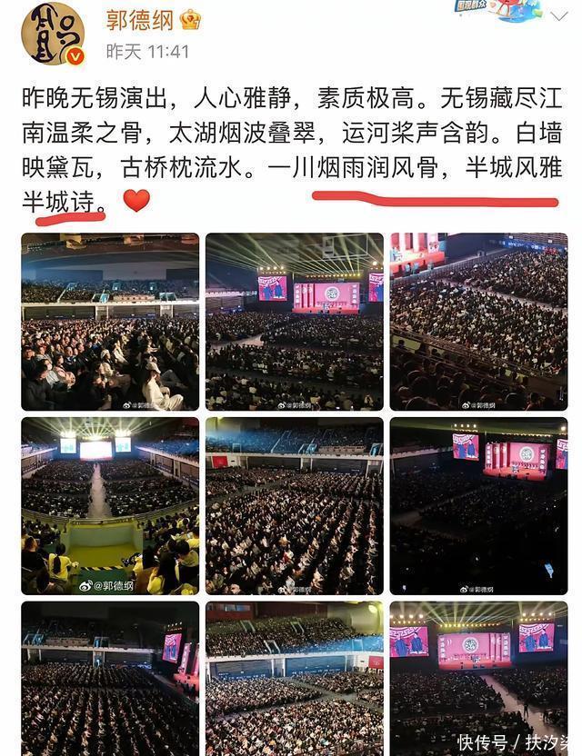 后续网传,西城区文旅局约谈了德云社并要求整改,不过截至12月9日,官方尚未明确确认约谈的真实性。 郭德纲未回应 约谈风波后,郭德纲没有回应,也一直没有停止演出,而且场上观众没有缺少,反而爆满。 无锡演出后,郭德纲发了一段特别有诗情画意的文字,被指回应被举报事件。 “昨晚无锡演出,人心雅静,素质极高。无锡藏尽江南温柔之骨,太湖烟波叠翠,运河桨声含韵。白墙映黛瓦,古桥枕流水。一川烟雨润风骨,半城风雅半城诗”。